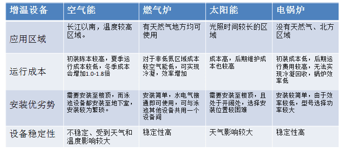 在泳池增溫系統(tǒng)中主要用到太陽能、空氣能、商用燃氣鍋爐、電鍋爐四種增溫設(shè)備