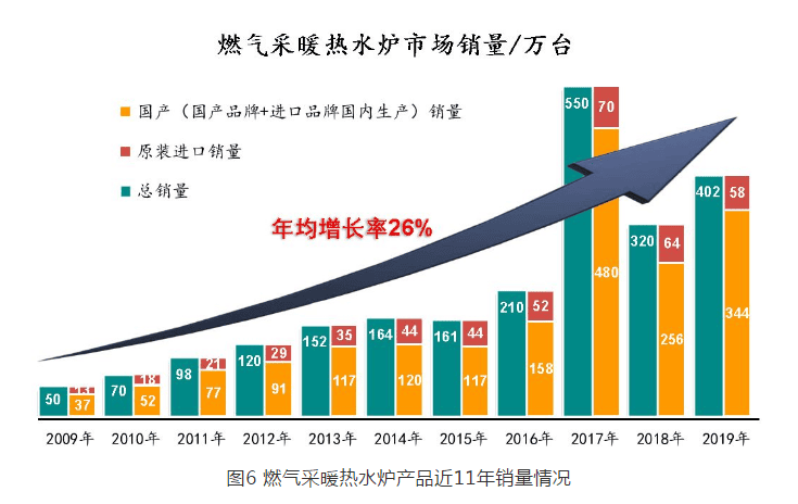 根據(jù)統(tǒng)計數(shù)據(jù),自 2009 年以來燃氣采暖熱水爐產(chǎn)品銷量急劇上升,中國國內(nèi)市場 2009 年銷量為 50 萬臺(原裝進口 13 萬臺),截至 2019 年底,國內(nèi)市場銷量達到了 402 萬臺(原裝進口 58 萬臺),年均增長率達 26% ,遠遠超出中國經(jīng)濟發(fā)展的平均速度。
