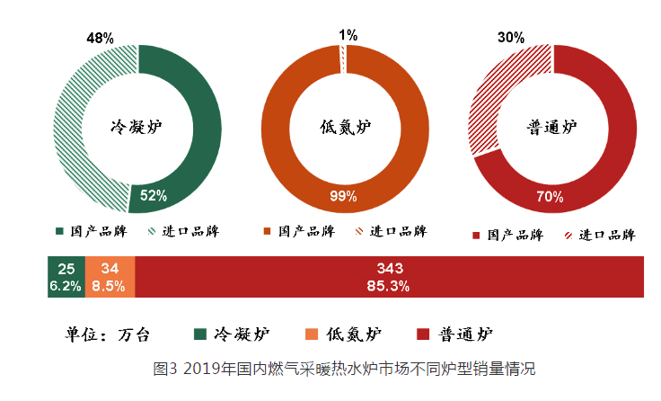 2019 年部分地區(qū)“煤改氣”工程要求安裝低氮型燃氣采暖熱水爐(以下簡稱低氮爐),根據(jù)數(shù)據(jù)統(tǒng)計情況,全年低氮爐銷量為 34 萬臺,占全年總銷量的 8.5% 。其中,國產(chǎn)品牌低氮爐銷量為 33.7 萬臺,占低氮爐全年總銷量的比例超過 99% ;進口品牌低氮爐銷量為 0.3 萬臺,占比不到 1% 。